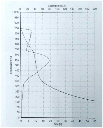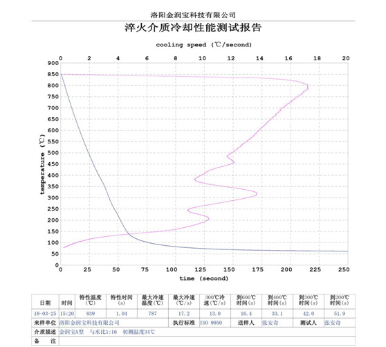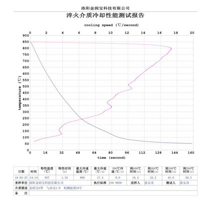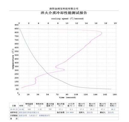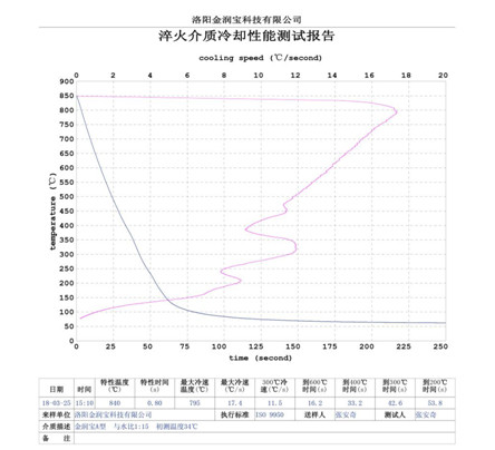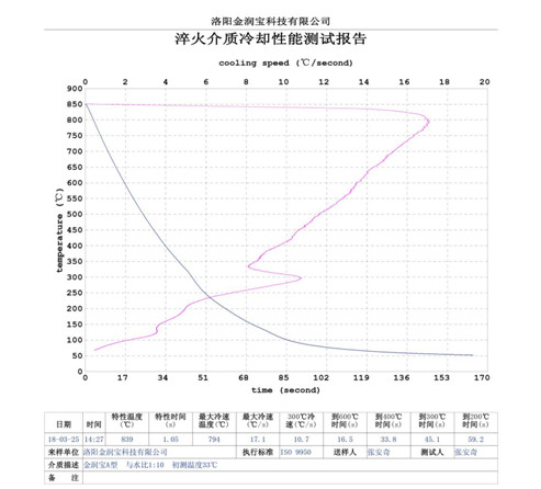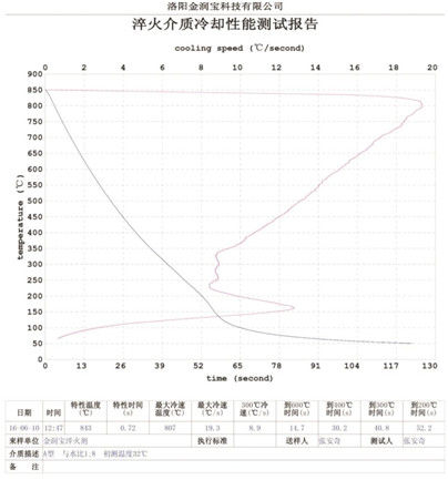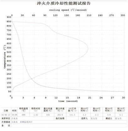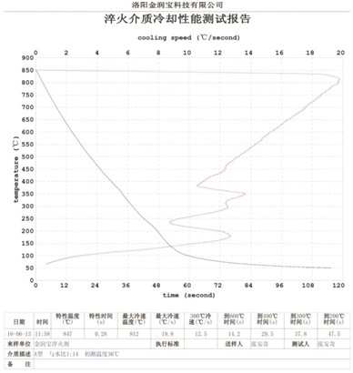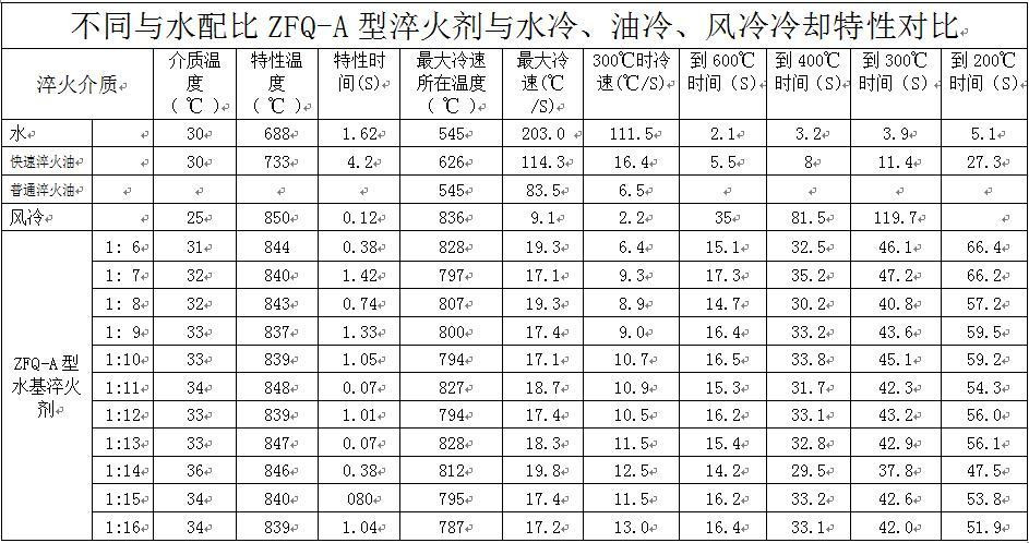 淬厚大件高鉻鑄鐵適宜的ZFQ-A型淬火劑的濃度:原液與水配比1:6,其 大冷卻速度150C/s——200C/s之間, 大冷卻速度所在的溫度在7800C——8300C之間,在3000C的冷卻速度小于6.50C/s,在3000C到2000C馬氏體轉變溫度區域內所用時間大于20秒(S),(采用冷卻介質測定儀測定,測定溶液溫度300C,)。